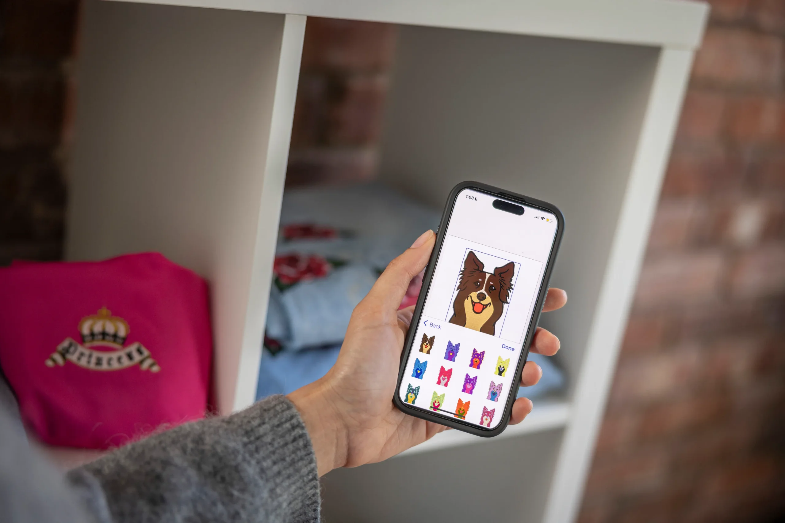 Dzięki łączności bezprzewodowej LAN możesz śledzić postępy haftu za pomocą aplikacji mobilnej My Stitch Monitor na urządzeniu z systemem iOS lub Android™. Śledź postępy w projekcie i otrzymuj powiadomienia o konieczności zmiany nici lub zakończeniu haftu.